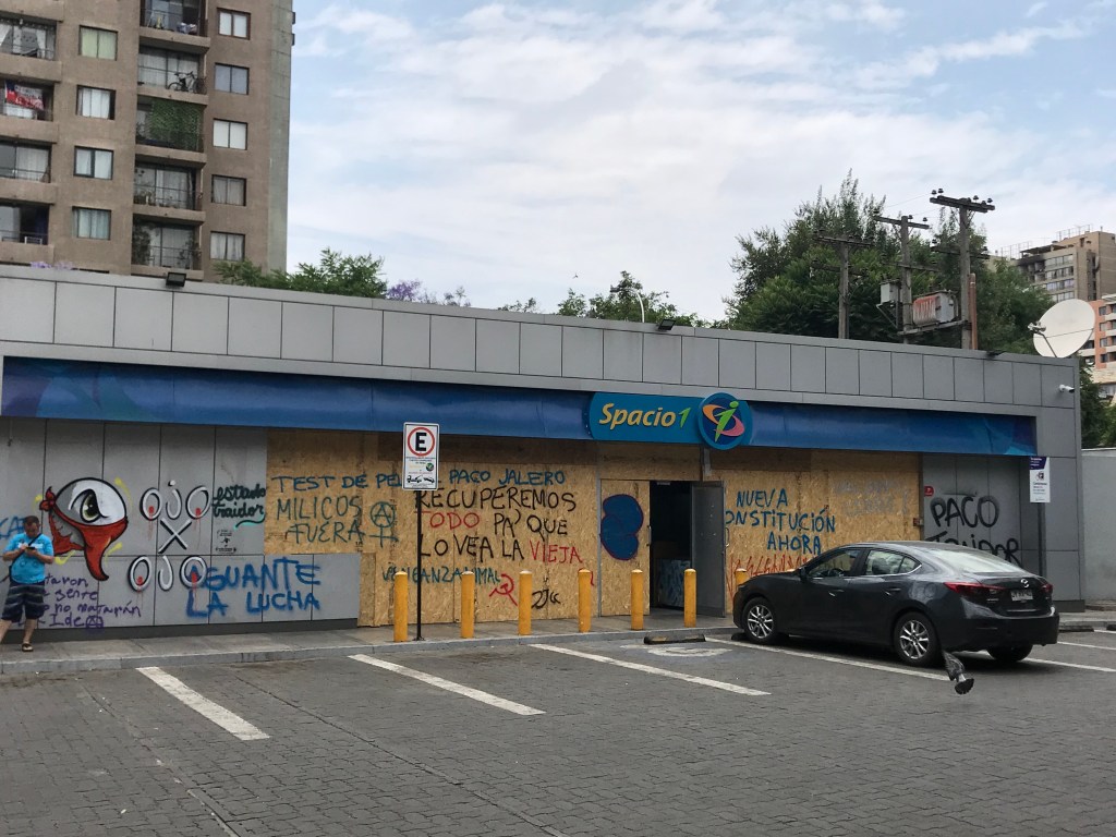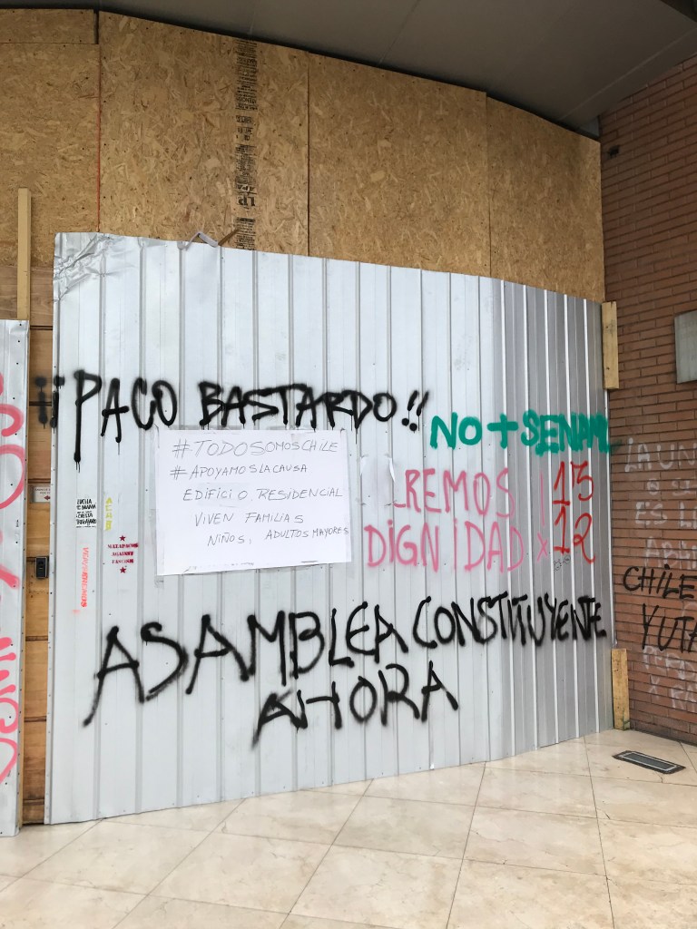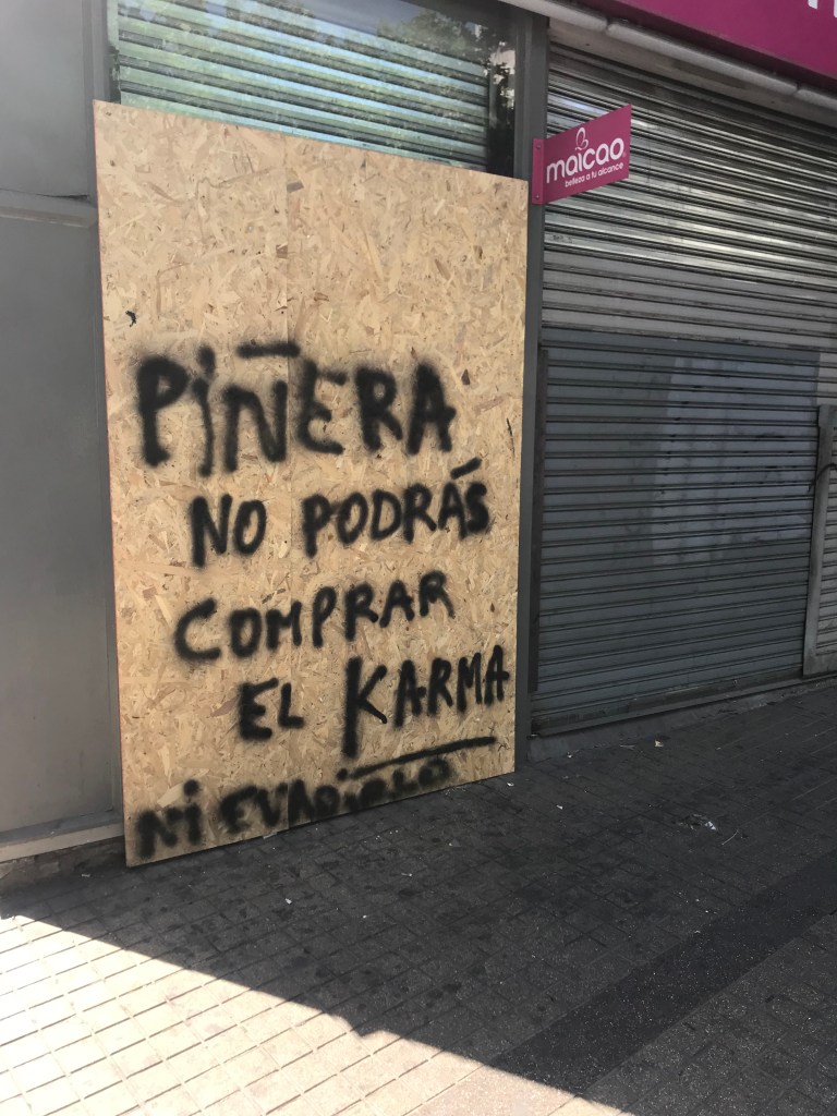 This was typical – a boarded up window with some statement slamming the center right president, Pañera. (This one says he can neither buy karma nor avoid it.) Chile is prosperous and modern – but not everyone has prospered. They want change – and have started to protest. Will protest turn into revolution?