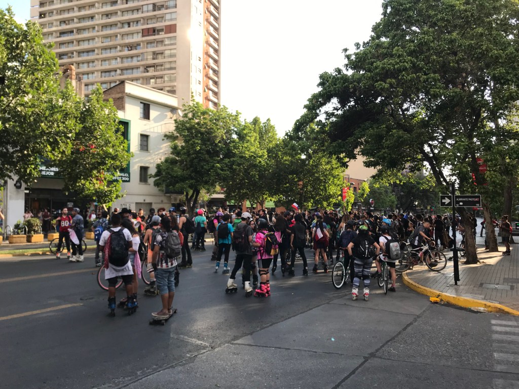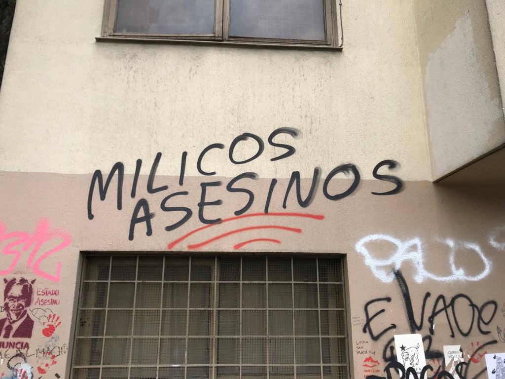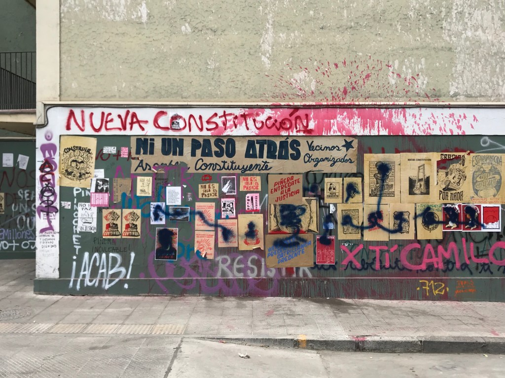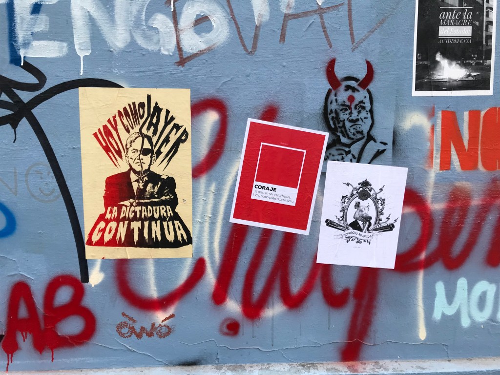 I wrote on Facebook that most tourists take pictures of art and architecture. Here, given the local situation and the brevity of the Santiago portion of my trip, most of my pictures are of graffiti, protests, broken glass and other evidence of protests.