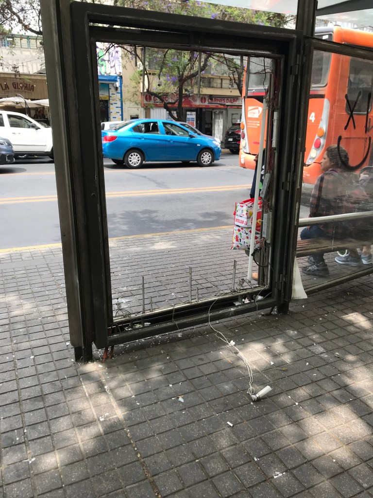Most of the bus stops I saw had their glass broken.