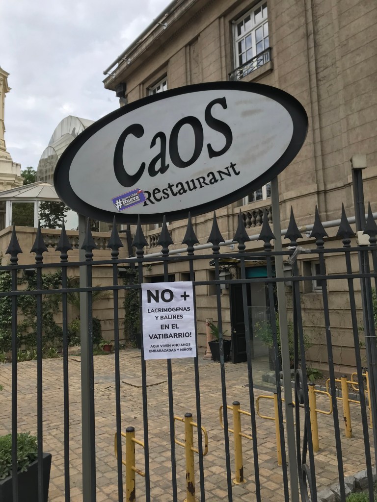 It is said that some people just want chaos, which was not lost on me when I saw this sign – at the Caos Restaurant. This sign asks for no tear gas pellets; pregnant women and children live here.