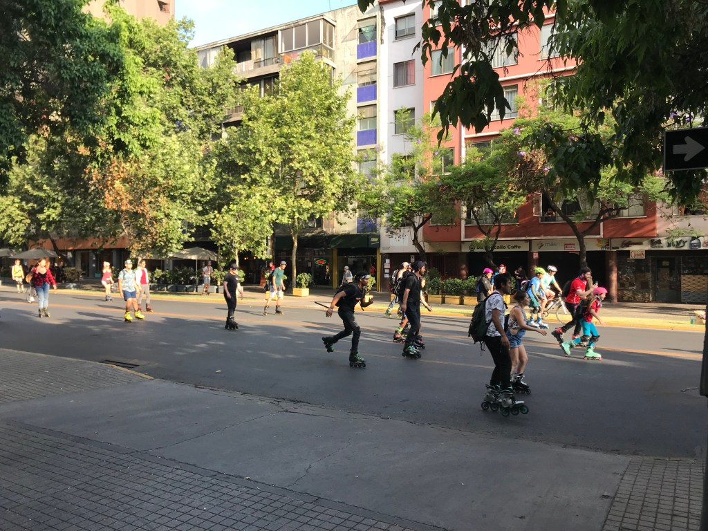 Sunday evening we saw something more pleasant – a roller skate/rollerblade/bicycle parade of sorts.